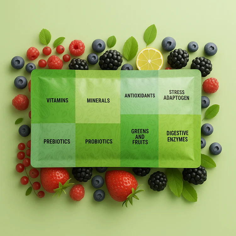 It combines multivitamins, minerals, antioxidants, prebiotics, probiotics, adaptogens, superfoods, and digestive enzymes — all working together to support your energy, gut health, immunity, metabolism, and overall wellness.